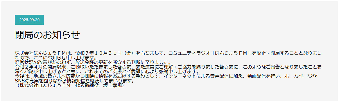 ![]() 廃止情報:https://honjofm.jp/news/%e9%96%89%e5%b1%80%e3%81%ae%e3%81%8a%e7%9f%a5%e3%82%89%e3%81%9b/  | ||||||||||||||||